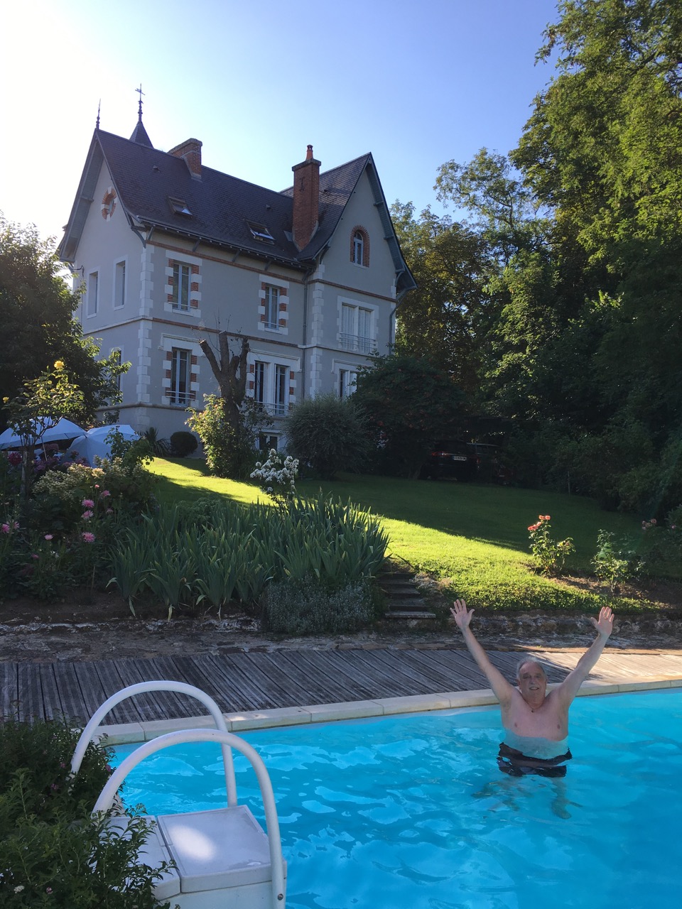 Breaking the journey to Cherbourg via Gien. What a nice place and both of us “in the pool”! Nice end to the holiday…