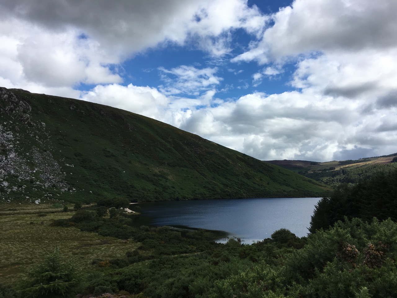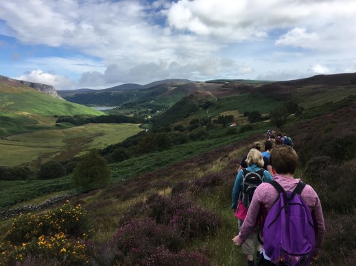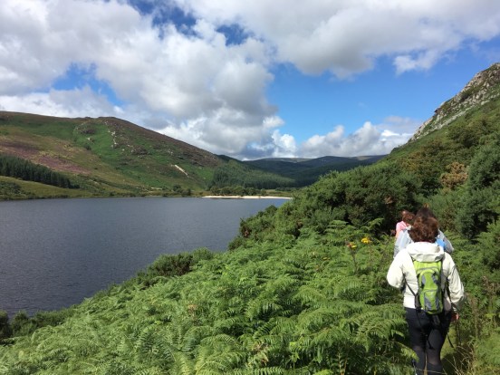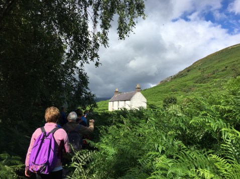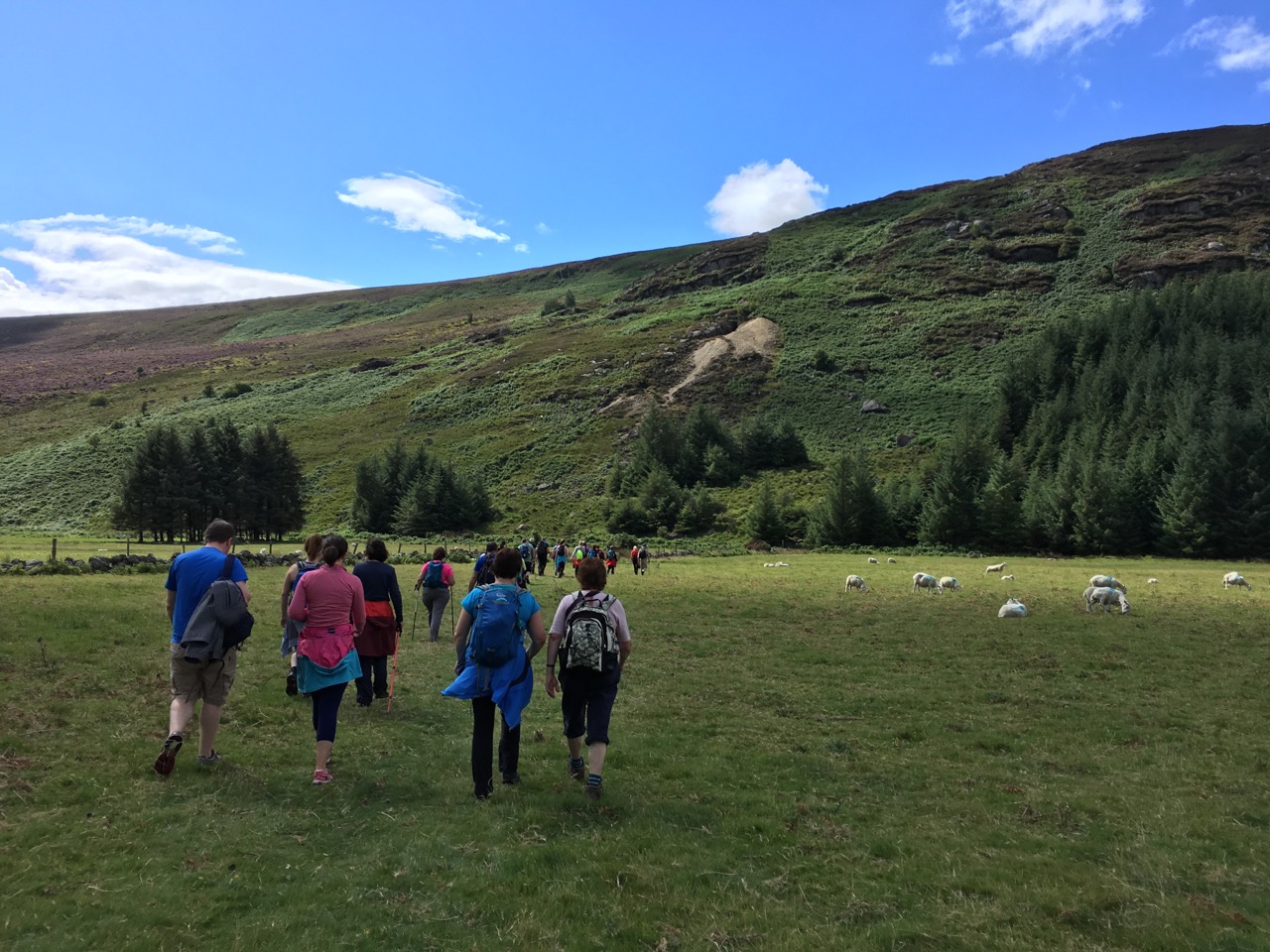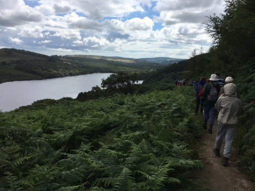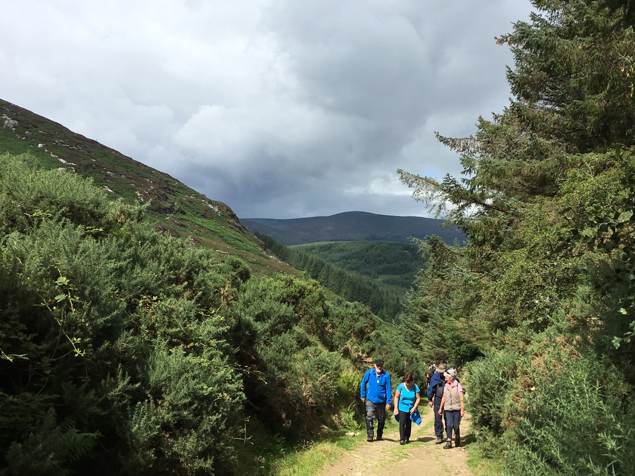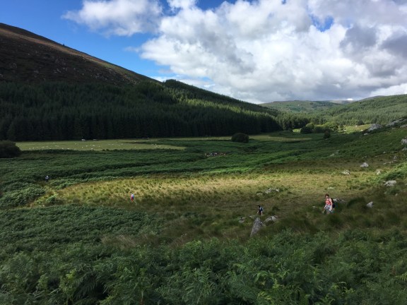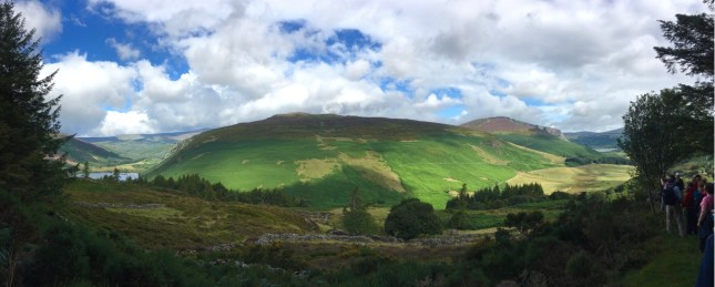 Roundwoodの村から少し斜面を上ったところを出発して、尾根をひとつ越えると、後ろ側の谷に出ます。いつもは「ピアゲート」またはロッホダンの湖のほうまで車で行って、そこから歩きはじめですが、今回は尾根を越えて向こう側に降りて、さらにロッホダンをぐるっと回って、向こう側の斜面を登るという長いコースでした。