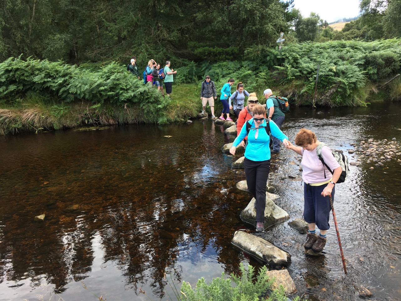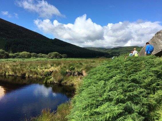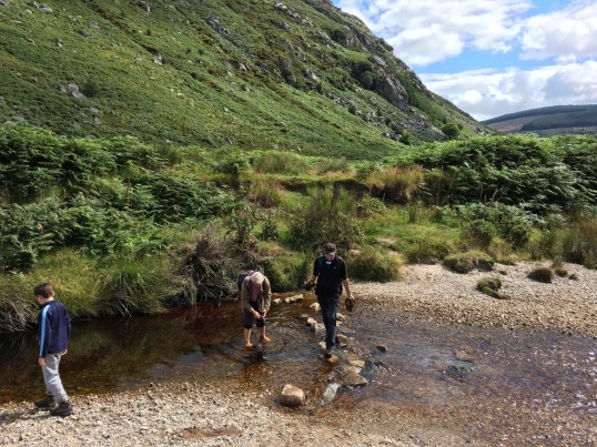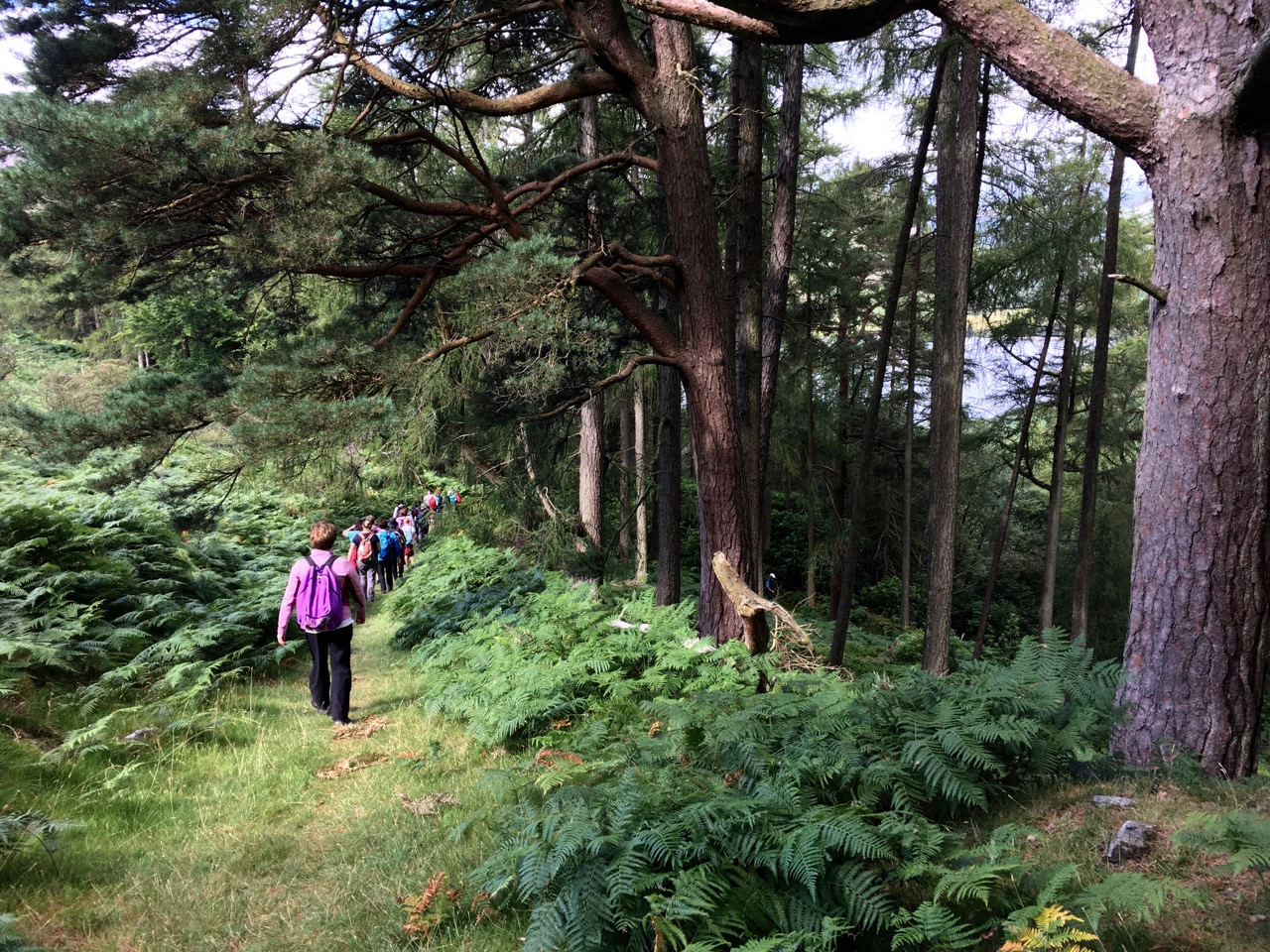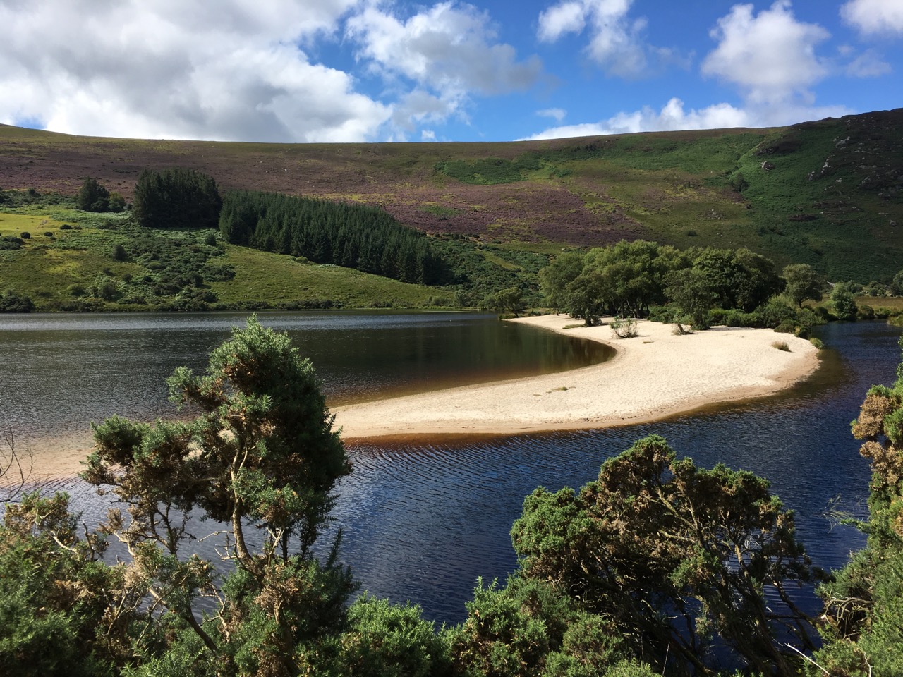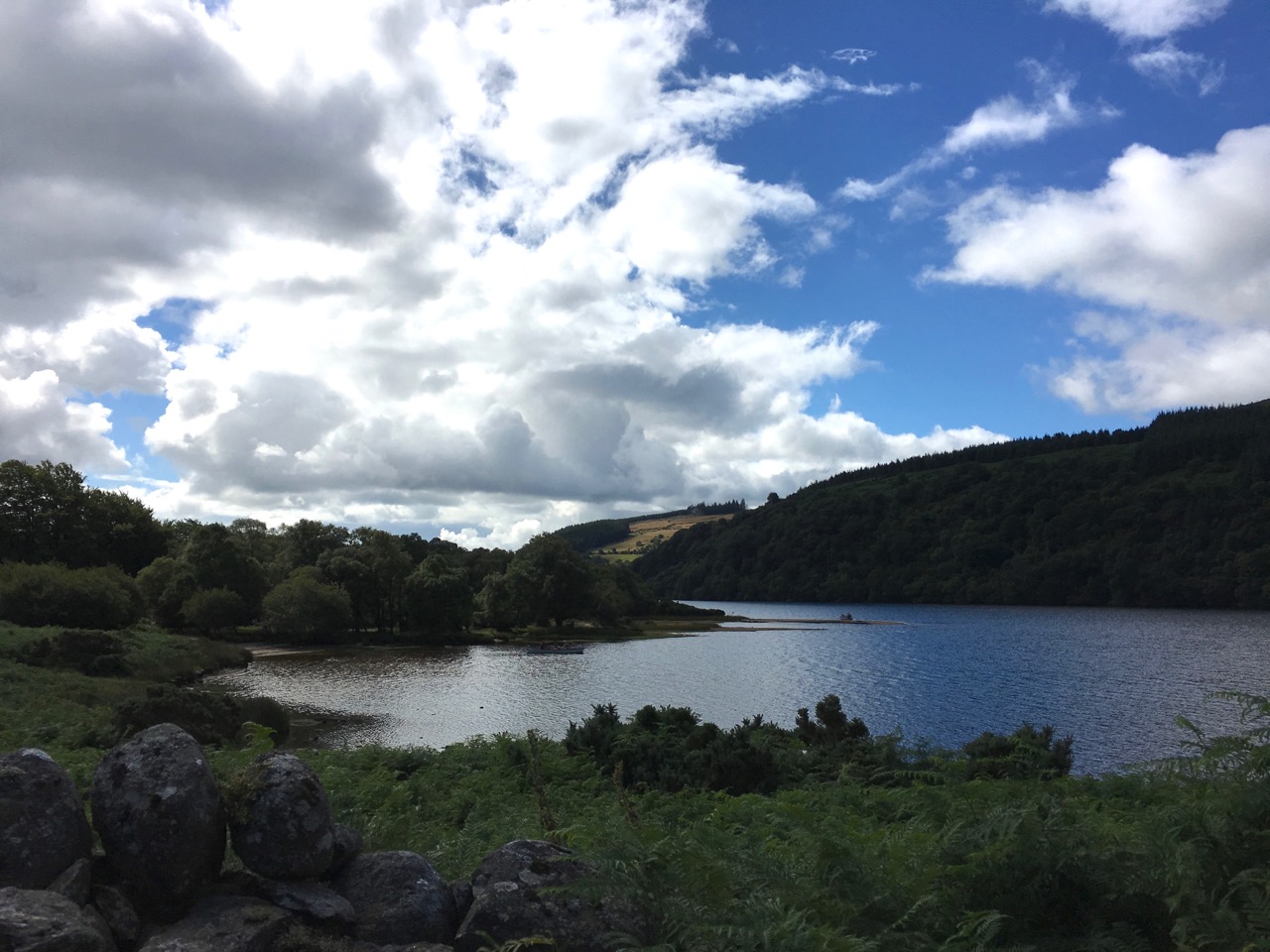 Roundwoodの村から少し斜面を上ったところを出発して、尾根をひとつ越えると、後ろ側の谷に出ます。いつもは「ピアゲート」またはロッホダンの湖のほうまで車で行って、そこから歩きはじめですが、今回は尾根を越えて向こう側に降りて、さらにロッホダンをぐるっと回って、向こう側の斜面を登るという長いコースでした。