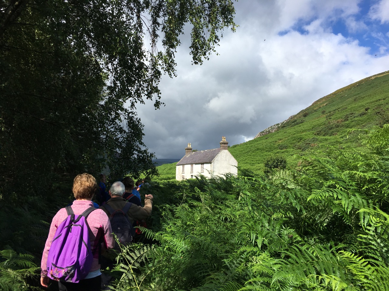 尾根の斜面のところに、何軒かの家が廃墟になって残っているところがあり、そこで立ち止まって土地の歴史の言い伝えについての話がありました。19世紀の半ばごろ(つまり日本で言えば明治時代)まだこのあたりに、いくつかの家族が住んでいたけれども、少しずつ減っていって、最後は誰も住まなくなったそうです。