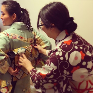 Nous sommes toutes tellement heureuses d’être ensemble pour nous ‘entraîner’ à nous habiller en kimono… Yukata+Han Haba Obi ou Kimono + Han Haba (dans mon cas), pour Shiori chan c’est toujours son très somptueux Homon-Gi avec un très beau Fukuro-Obi.