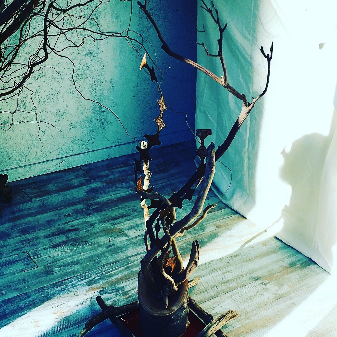 なんだか面白いものを作ってるな〜廃材を切り抜いた錆びた金属と流木の組み合わせで、こんなふうに生花みたいに見えるなあ〜と見ていましたが…. こんな空間に展示されているとは!