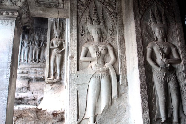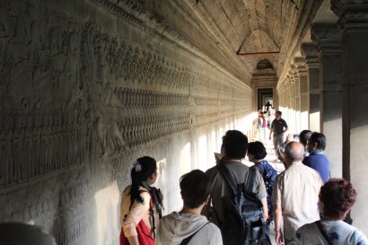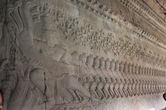 参道のつきあたりの一段と高くなったテラスを通り抜け大塔門に入ると、そこは第一回廊。壁面に浮き彫り絵図が展開する。ここで注目したいのは「乳海撹拌」の場面である。デヴァ(神々)と阿修羅(悪神)がナーガ(蛇の神)で綱引きをして海(宇宙)をかきまわし甘露(収穫)を見出すという物語である。このモチーフは他の多くの遺跡の浮き彫りにも描かれている。アンコールトムの城門の手前の橋の欄干でも、神々が蛇の胴体で綱引きをしている。カンボジアの人々は、このモチーフがとても好きだ。