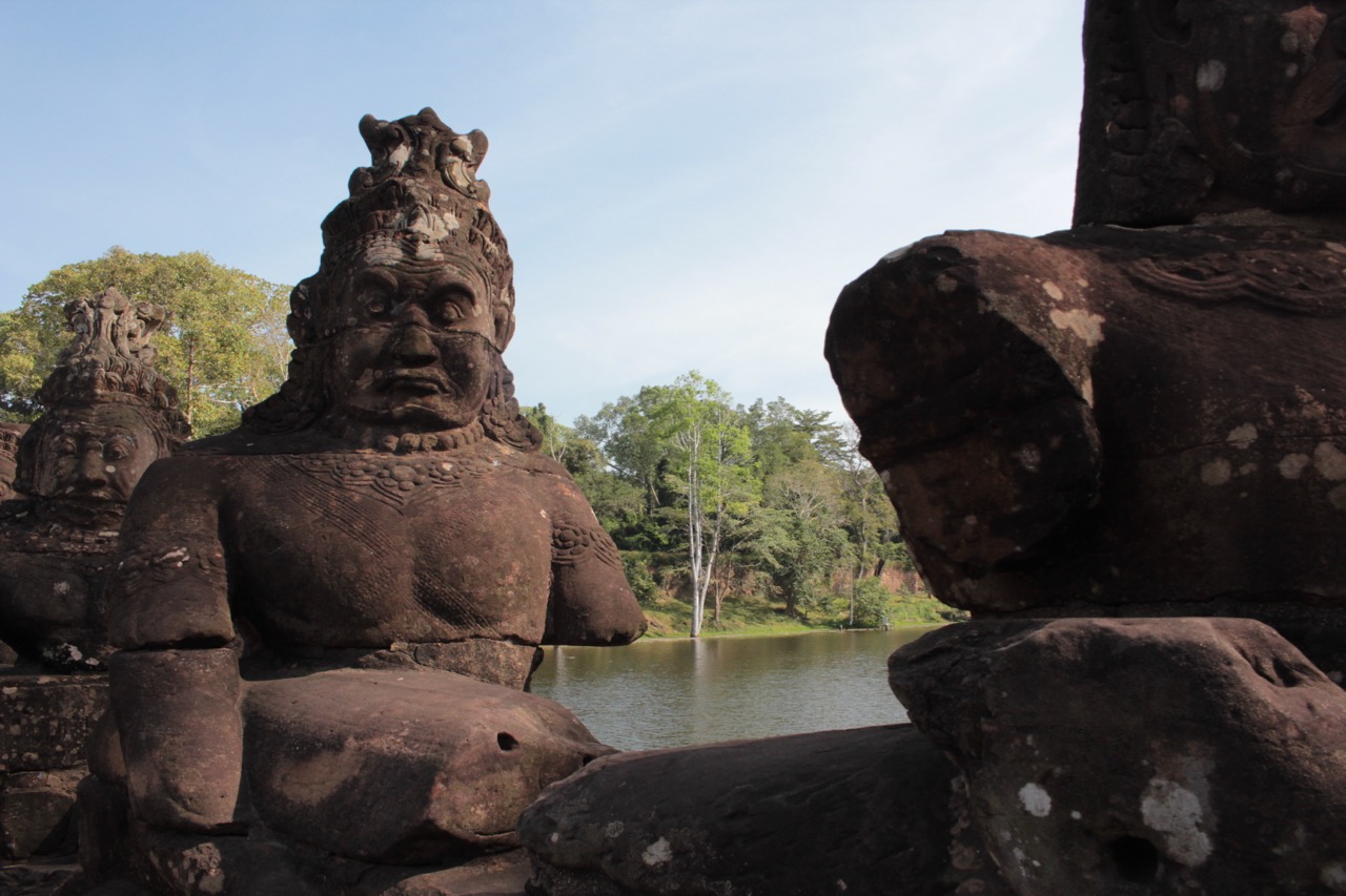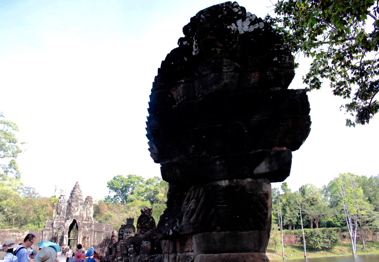 Chez les Cambodgiens, hindouisme et bouddhisme cohabitent sans problème, un peu comme pour les Japonais le shinto et le bouddhisme. Le serpent géant Naga est au centre de leur légende : il se trouve un peu partout dans les temples, en relief sur les murs mais aussi dans les décorations des ponts, etc en 3 D et même en ville on en voyait des versions modernes !