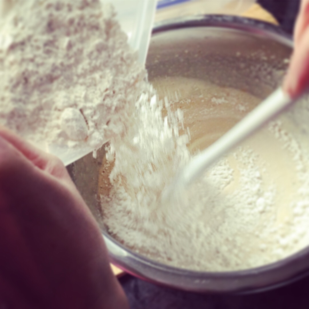 溶かしバター、小麦粉、ベーキングパウダー、オレンジの皮のすりおろしを入れて、よく混ぜる。
