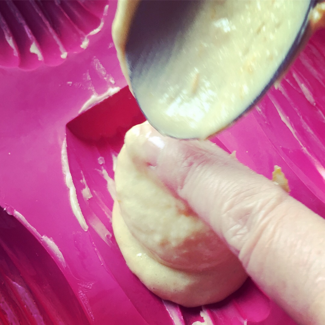 シリコンの型に入れる(移動しやすいようにオーブンの棚のグリルの上に並べておくこと)。