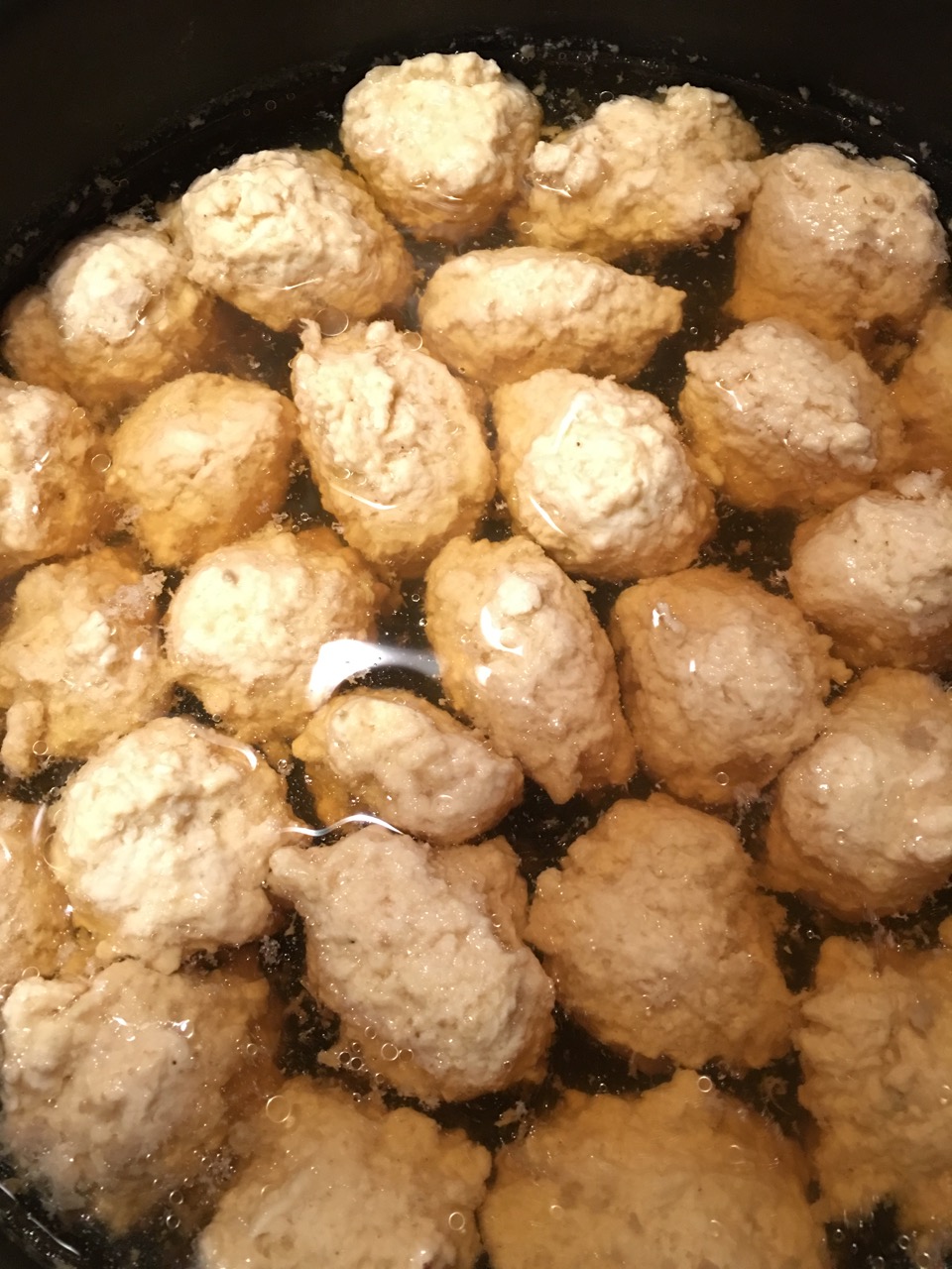 (1)椎茸の煮汁に出汁を足して鶏団子煮て