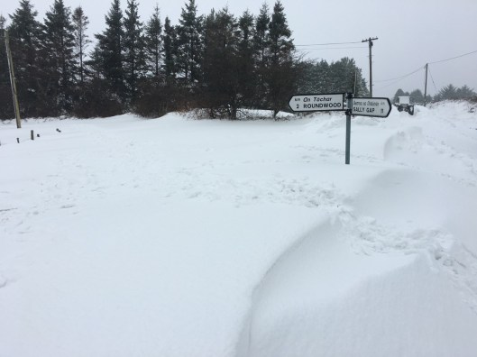 Mais enfin c’est quand même pas sorcier, surtout en considérant que la même quantité était chose quotidienne en Autriche!! La différence est qu’il ne se passait rien pendant une semaine… et ensuite le pays entier était en panique. Les gars du coin ont sorti leurs grosses machines agricoles pour dégager les routes (puisqu’ils ont besoin d’atteindre leurs montons et vaches pour les nourir! ), l’armée est venue nettoyer les rues dans le village ( les écoliers devaient aller à l’église pour la cérémonie de confirmation!). C’était donc la manière très irlandaise de résoudre la situation qui était intéressante pour moi.