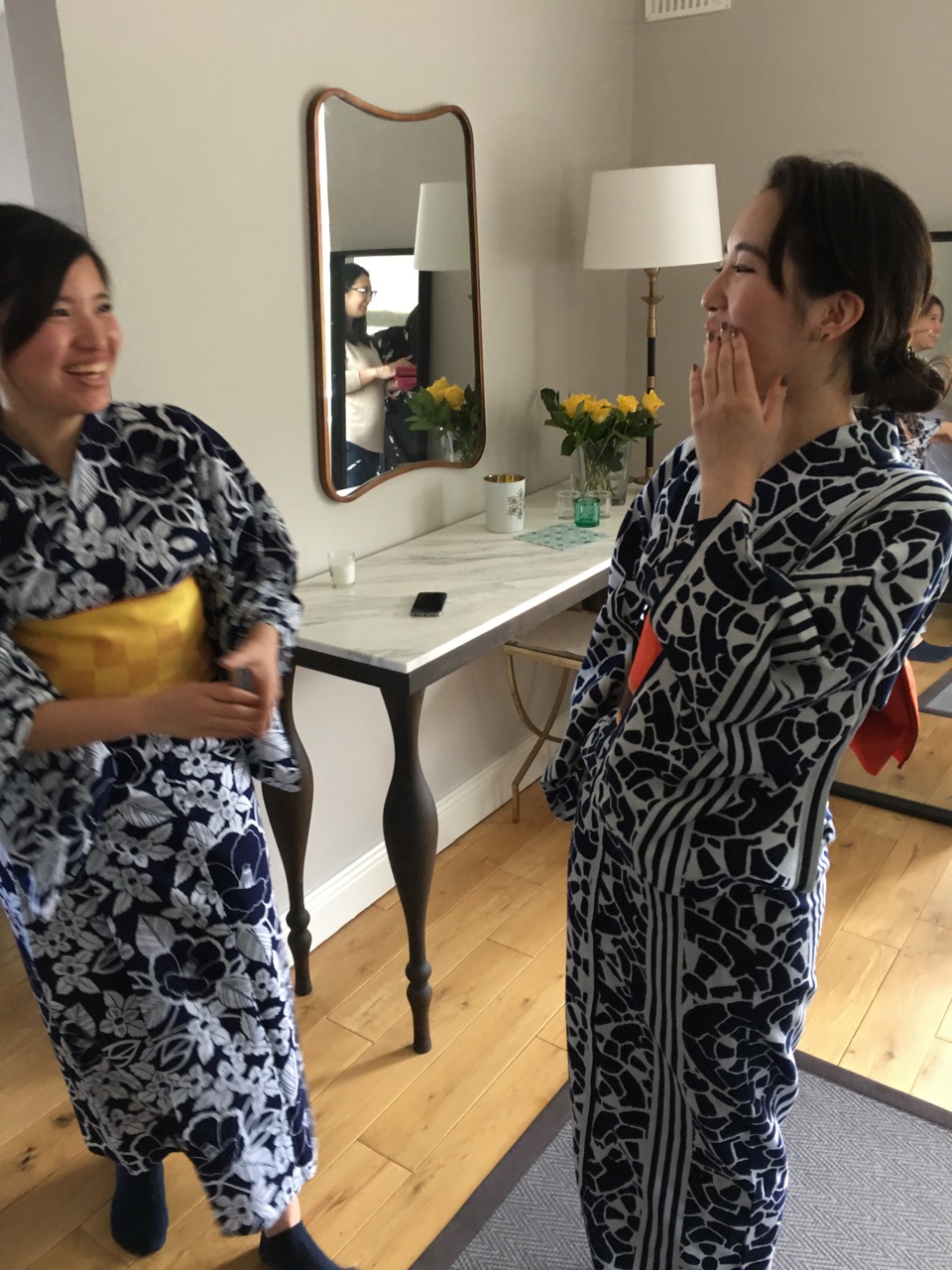 たくさん友だちが集まって浴衣の着付けの練習会をしました。