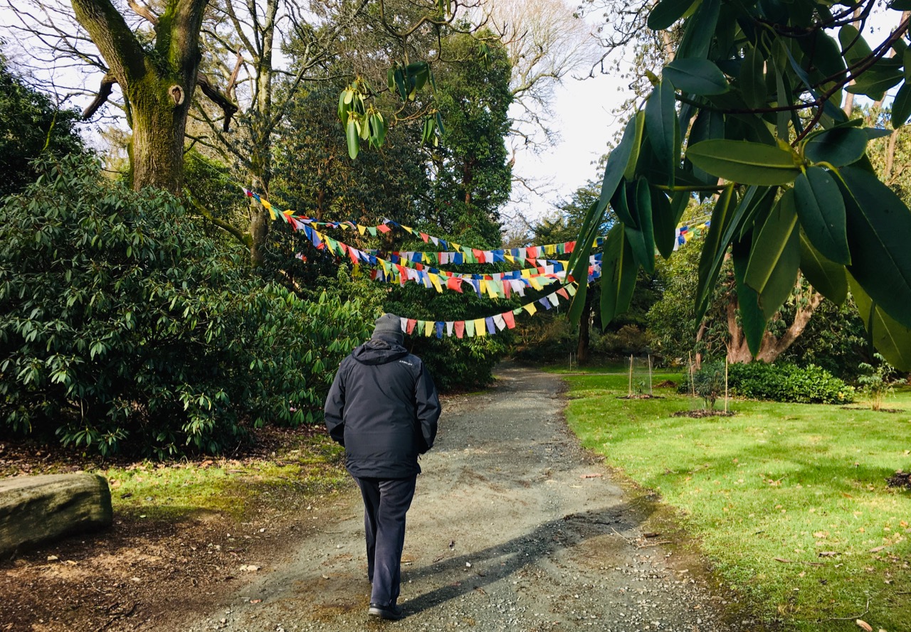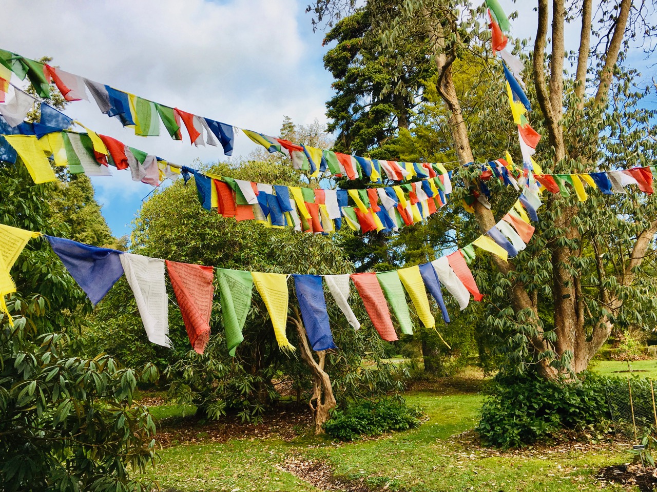 まだ寒い土の中で春を待つ白や黄色の花 大きな樹々 チベットの祈りの旗、蕾をたくさんつけた木蓮や石楠花。 美しい時間に感謝。