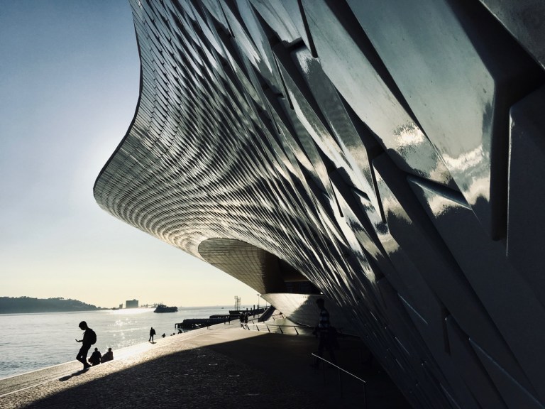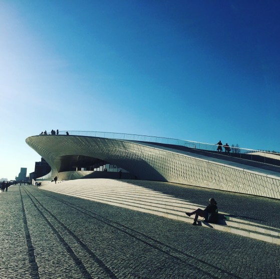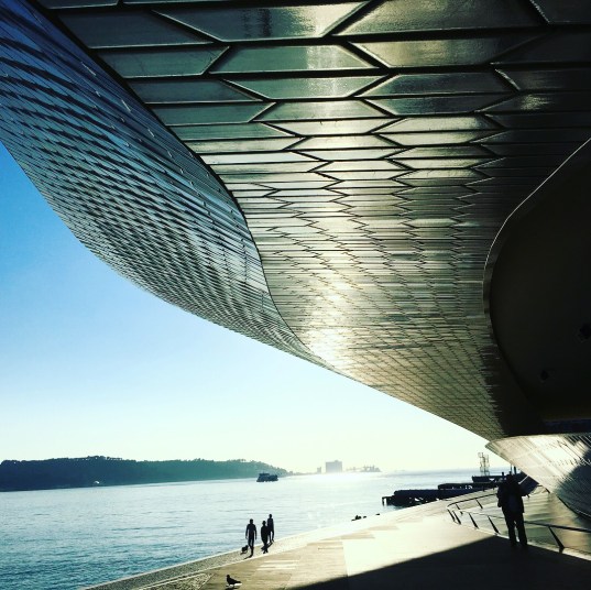 Belém観光の最後はMAAT (Museu Arte Arquitetura Tecnologia )。「この建築物は外界へ向かって泳ぎ出る魚のような、鱗模様のタイルが特徴なんだよ。タイルはポルトガルの建築物に無くてはならない材料だから、その現代的な意味をあらわしているんだ。」と三輪タクシーtuk-tukの兄ちゃんが解説してくれました。外のゆるやかなスロープを登って上に出ると、広々とした川面と対岸とこちら側を結ぶ橋の眺めが気持ち良い。ちょうど午後の時間で西日でしたが、夕暮れはどんな景色になるのかな。。。このあたりは他にも面白そうな美術館がいくつか見えたけど、今回は中に入ってみることができず残念。またリスボンに来られたら次は行ってみたいなあ。街を歩いていると古い建物をリノベーションしている工事現場があちこちにありました。ー