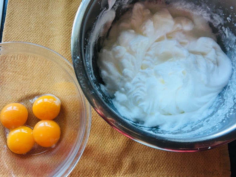 4) Beat the egg whites into stiff peaks in the other bowl. Then, carefully fold the whites into the egg yolk mixture.