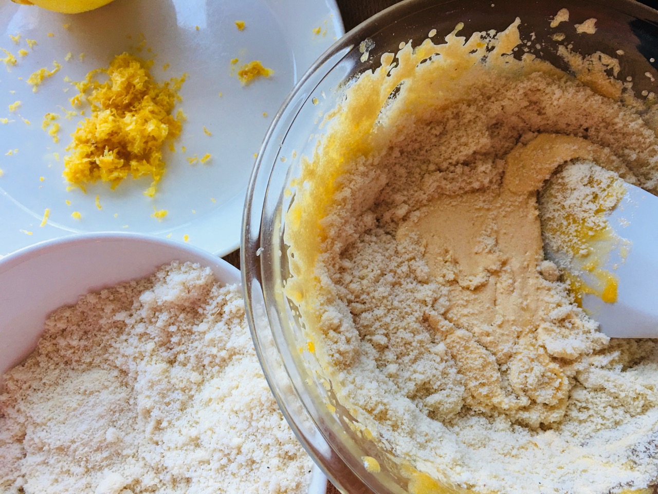 (6)黄身のほうに、アーモンドパウダーとレモンの皮を入れて混ぜる。