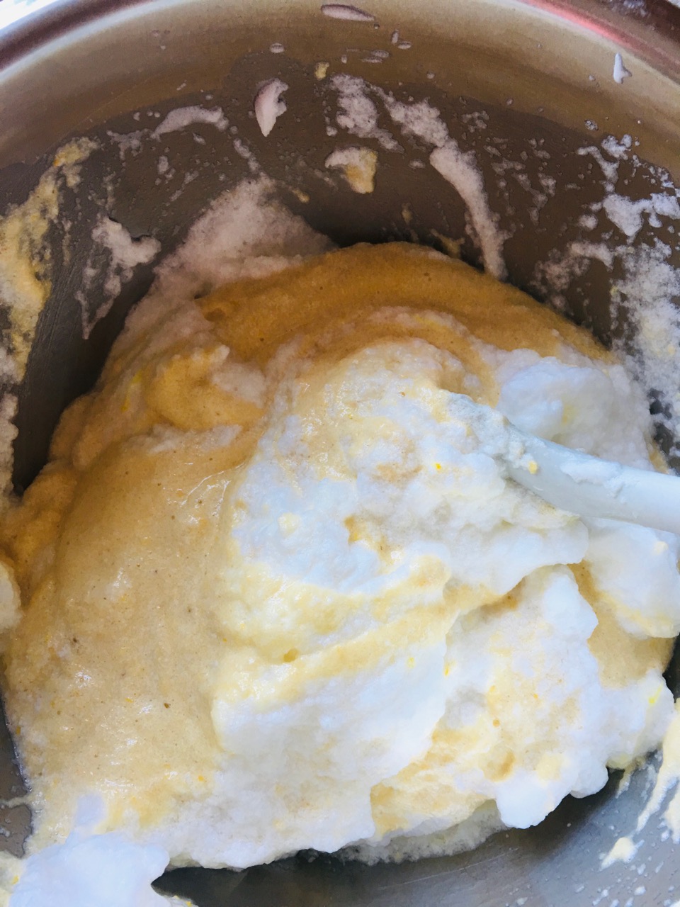 4) Beat the egg whites into stiff peaks in the other bowl. Then, carefully fold the whites into the egg yolk mixture.