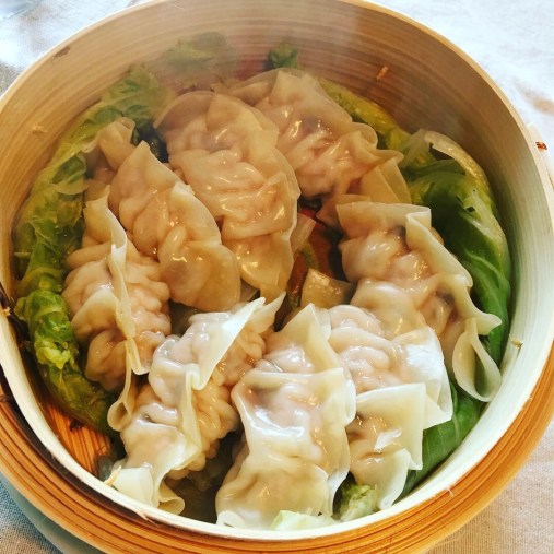 前菜のつづき 蒸し餃子。豚ひき肉に蓮根と干し椎茸入り、熱々を酢醤油で。下に敷いた白菜も喜ばれました。