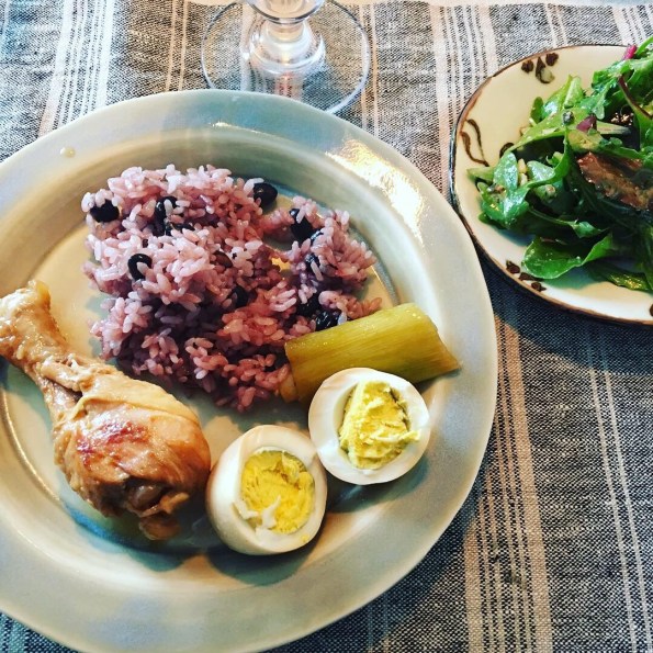 主菜 鶏肉のさっぱり煮 (酢、酒、醤油、生姜、長ネギ、ゆで卵)、黒豆ご飯と小豆ご飯(2合ずつ。余ったけれども冷凍にできるのでok)