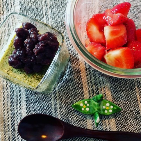 デザート 抹茶のムース(豆乳、寒天、ホワイトチョコレート、はちみつ、絹ごし豆腐、抹茶)、小豆餡添え。
