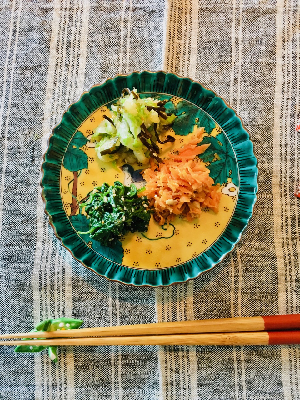 前菜 野菜3種盛り。白菜の塩もみに昆布と柚子胡椒胡麻、人参サラダ胡桃入り、ほうれん草の胡麻和え
