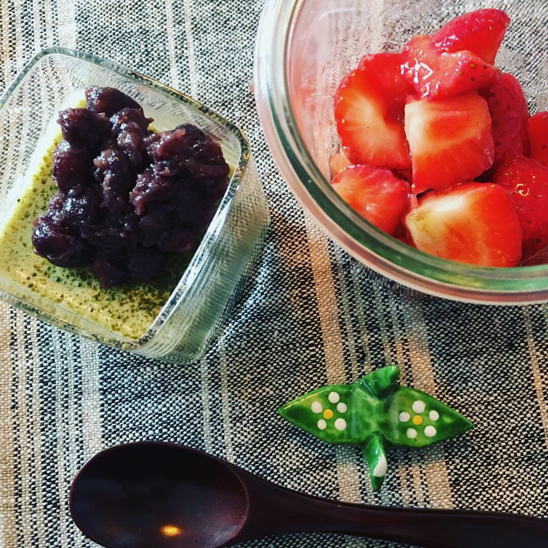デザート 抹茶のムース(豆乳、寒天、ホワイトチョコレート、はちみつ、絹ごし豆腐、抹茶)、小豆餡添え。