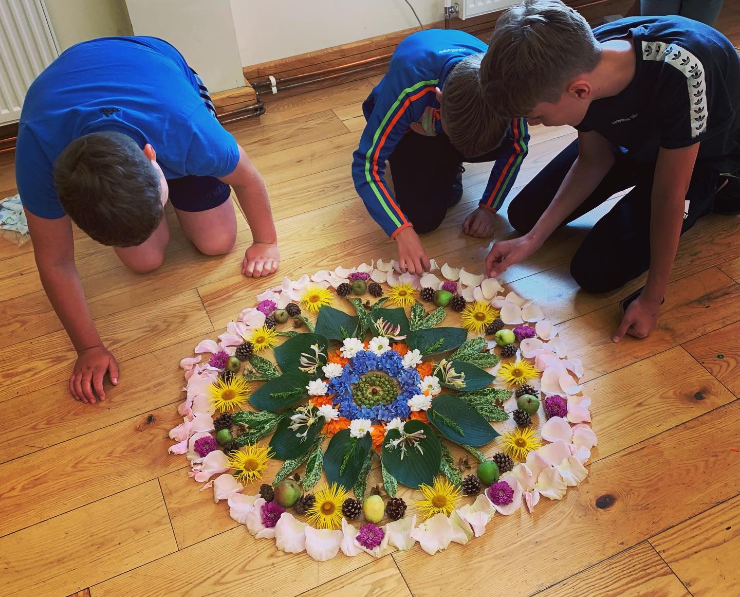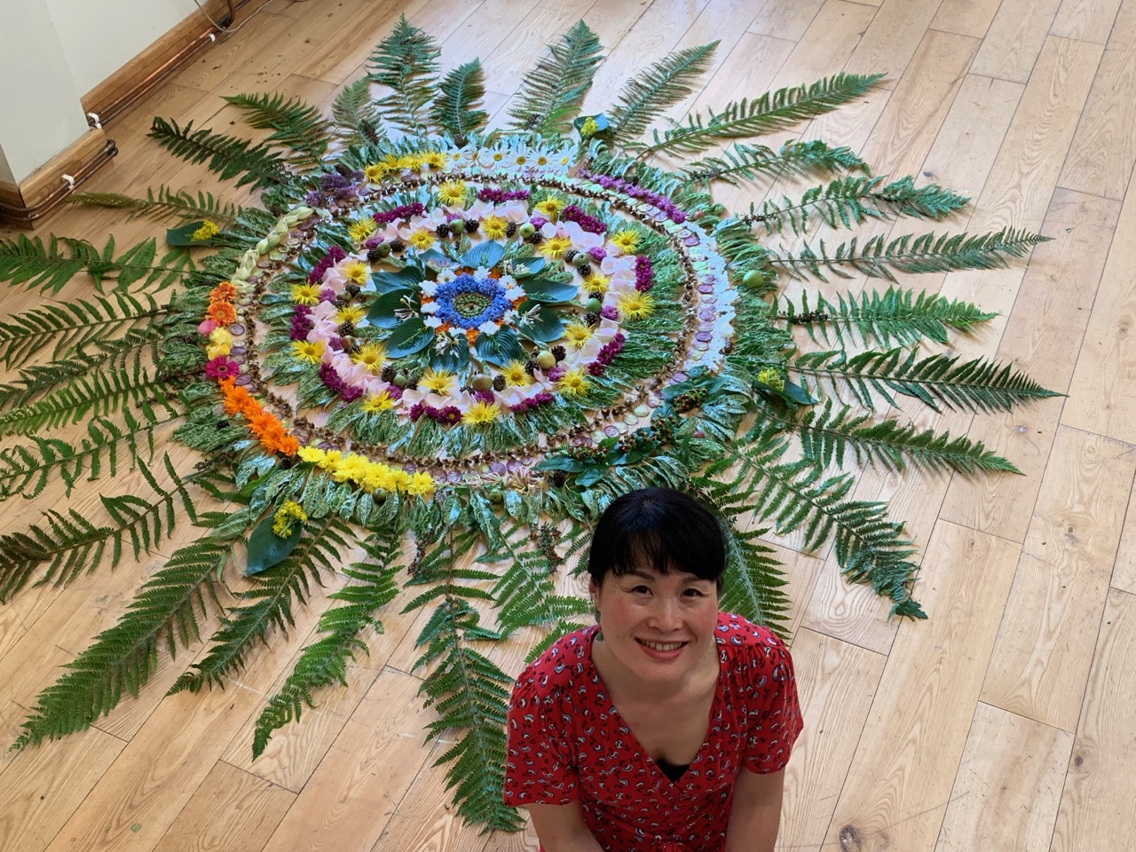 それから今年は友だちのMayumiさんが花曼荼羅をやりに来てくれて、カラフルで楽しくて お祭りの皆で作る曼荼羅 というアイデアがすごく皆の気に入って、「美しい!!」と大評判でした。