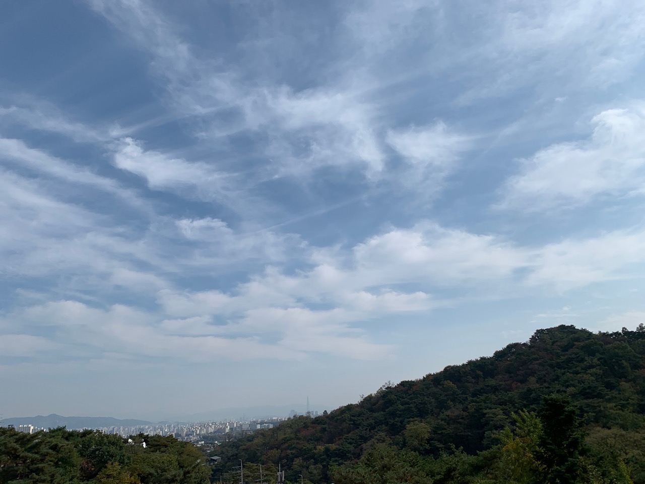 美味しいうどん 「カルククス」のランチの後、タクシーを拾って大統領官邸の後ろ側の山 (北岳山 Bugaksan) のほうへ登っていきました。長いきれいなトンネルを過ぎると(このトンネルは朴正煕大統領が作ったんだよ、とタクシーの運ちゃん)、もうすっかり山の中の趣。ところどころに紅葉も見えました。