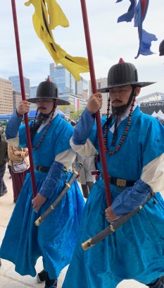 帰りは無料のシャトルバスで景福宮の近くまで。景福宮は見学せずに、正門のところからちょっとだけ覗きました。カッコイイ衛兵さんが交代していました。