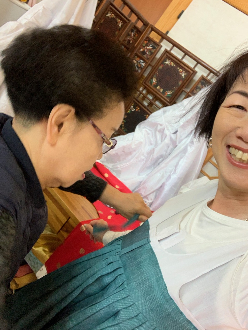 アイルランドでもTシャツとか着たまま、上から浴衣を着てもらいますが、こちらでも服を着た上から、ふわふわのペチコートを着せられました(昔の制服のスカートのように、肩にかけるところがついていました)。その上からチマを巻きつけて、あっというまに出来上がりました。(着せてもらいながら根性でセルフィーしてた汗)チマは平たい一枚の布にプリーツが入っていて、後ろが前から後ろに回して着るのだと初めてわかりました(つまり切れ目が後ろにくるのです)。