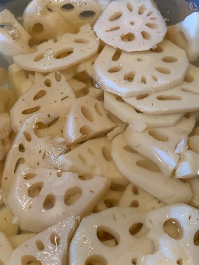 (4)蓮を切り茹でる。熱いうちに甘酢に入れて完成。11:30-11:40