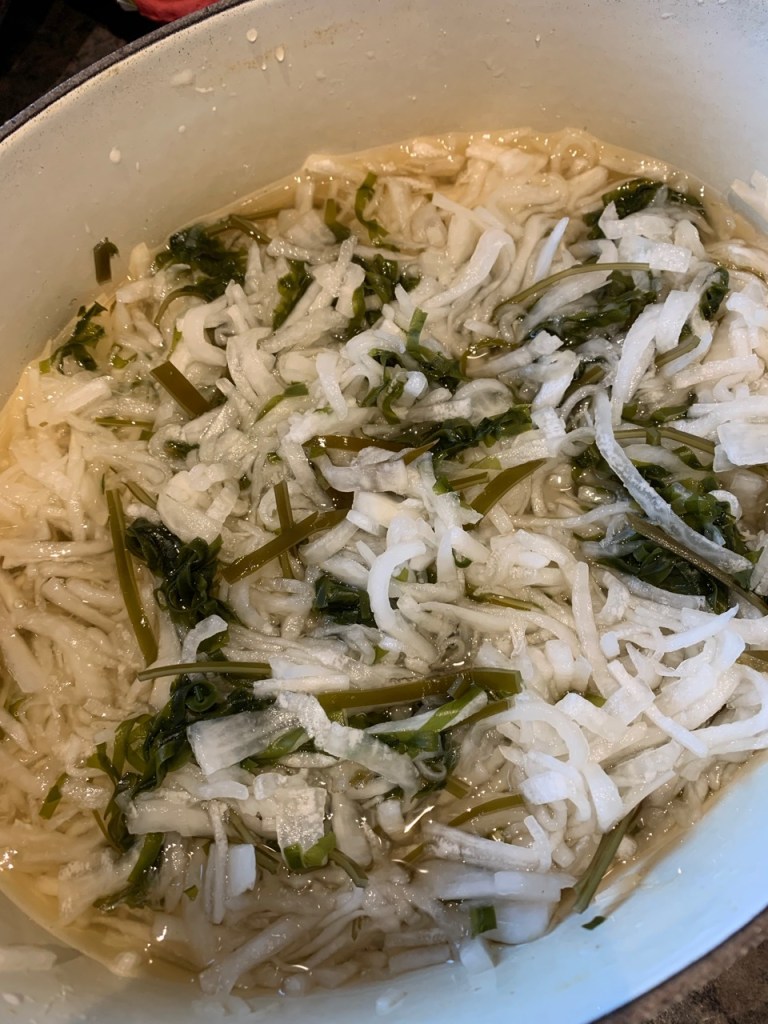 (10)なますの大根を切る、水にさらす、塩もみにして水洗いする。1本半分。(白いLeCreusetの大鍋につけた。出汁昆布に加えて、切り昆布も)15:15完了。