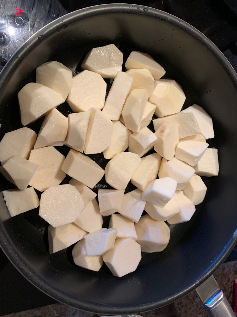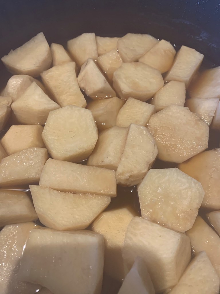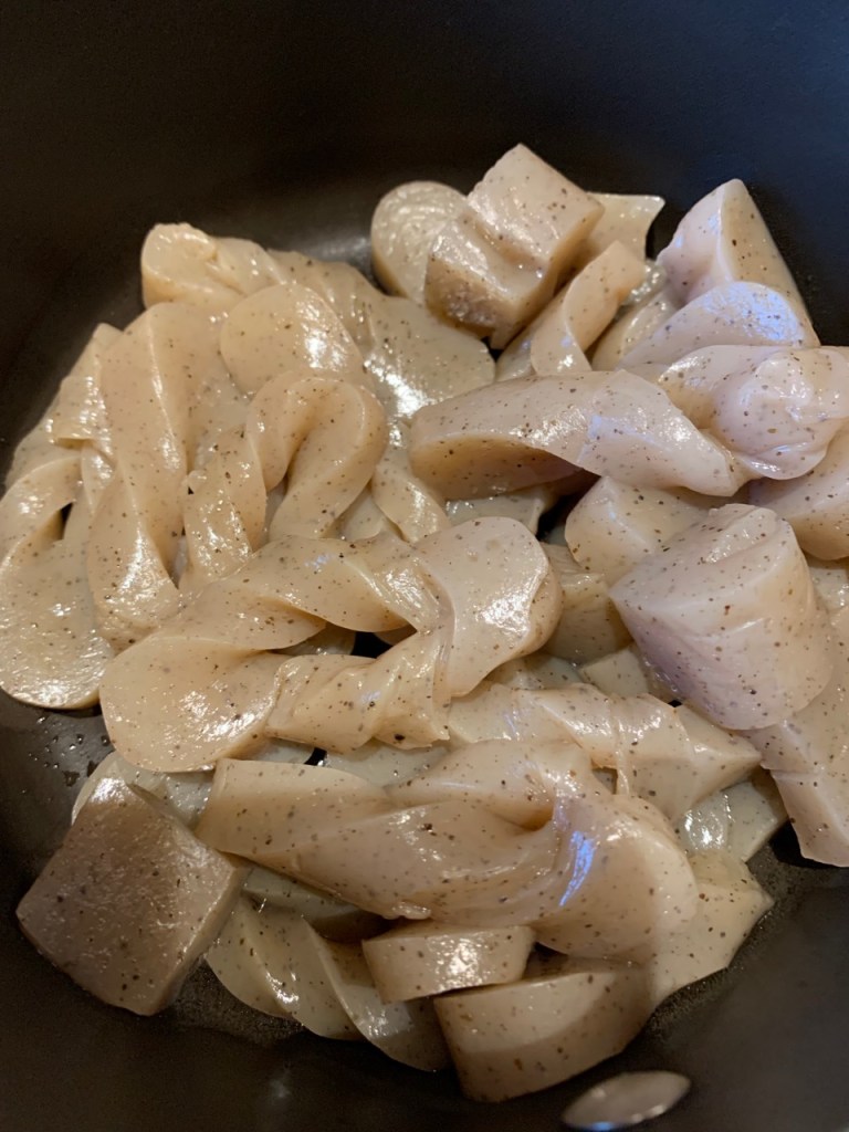 コンニャクは塩もみして茹でる。切って手綱に結ぶ。