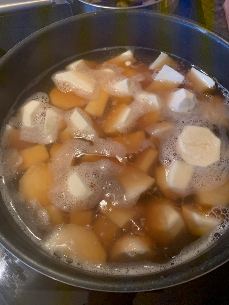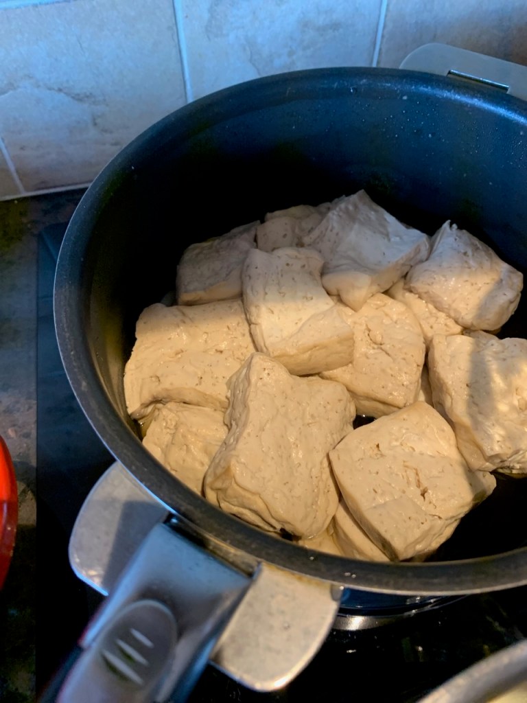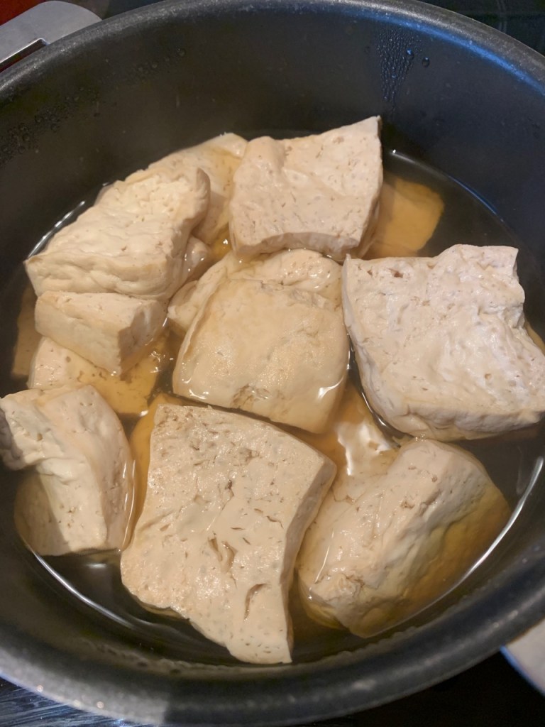 豆腐の煮汁と出汁 計5カップ、みりん大2、砂糖大1.5 醤油大2.5