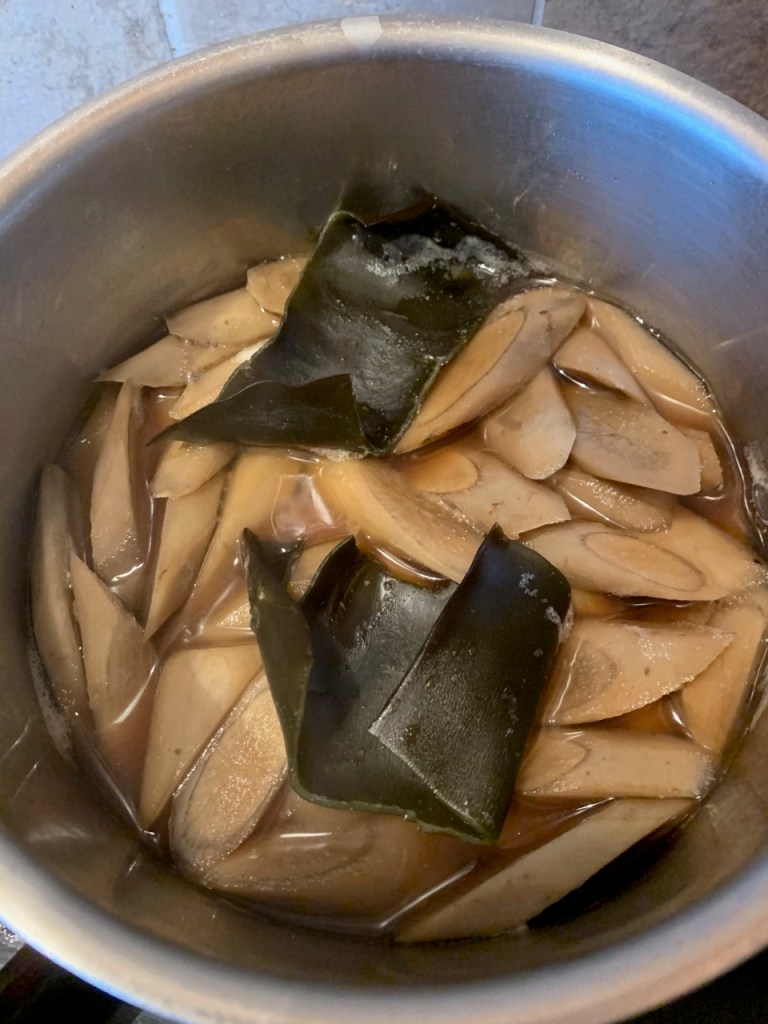 煮汁 (ゴボウの煮汁と出汁 計2カップ、酒しょうゆ、みりん各1.5