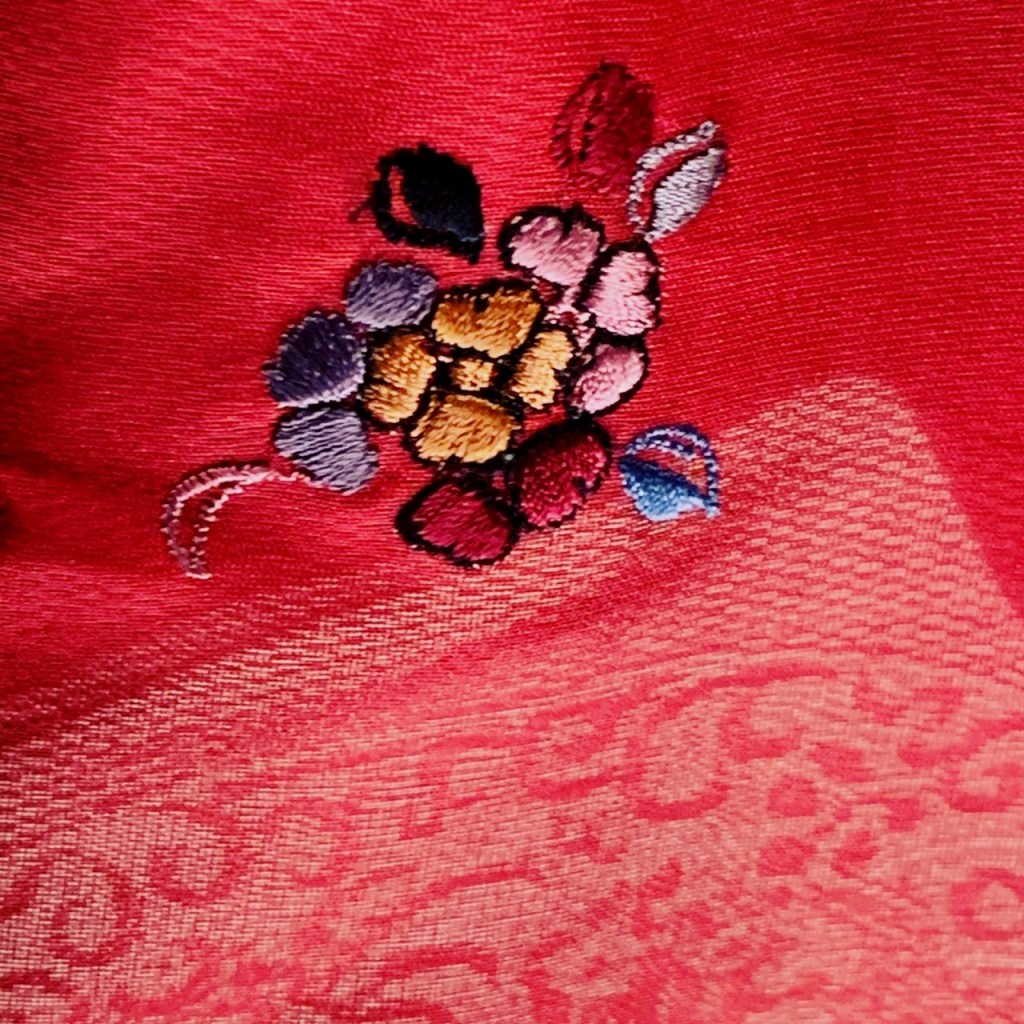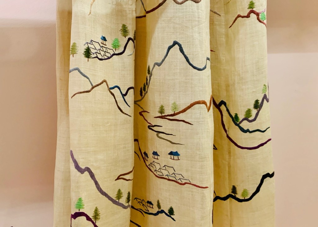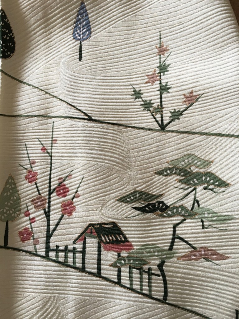Le chima (jupe) avec les montagnes et le village… ça m’a fait penser à des dessins de paysage à l’incre de chine, mais aussi au motif d’un des kimonos que j’ai hérité de ma mère.