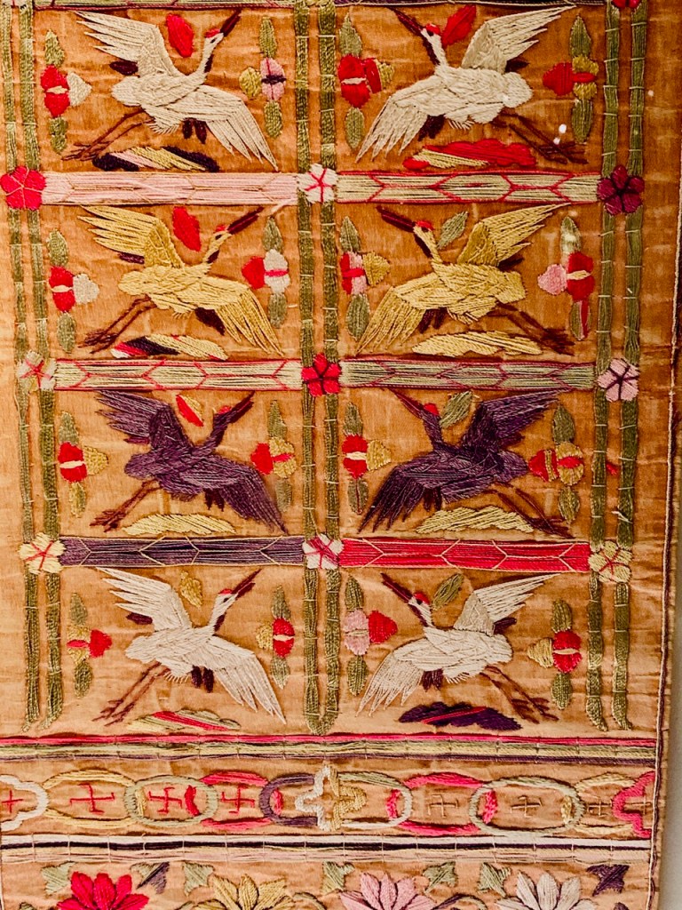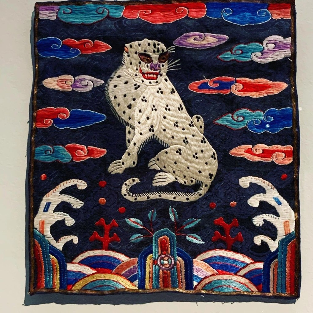 この豹や鶴の刺繍は、hungbae 胸背 というもの。Mandarin squareとも呼ばれ、朝鮮時代の武官や文官の位階をあらわすため、四角い布に刺繍の縫取りをしたものを前後につけていた。