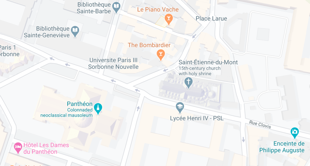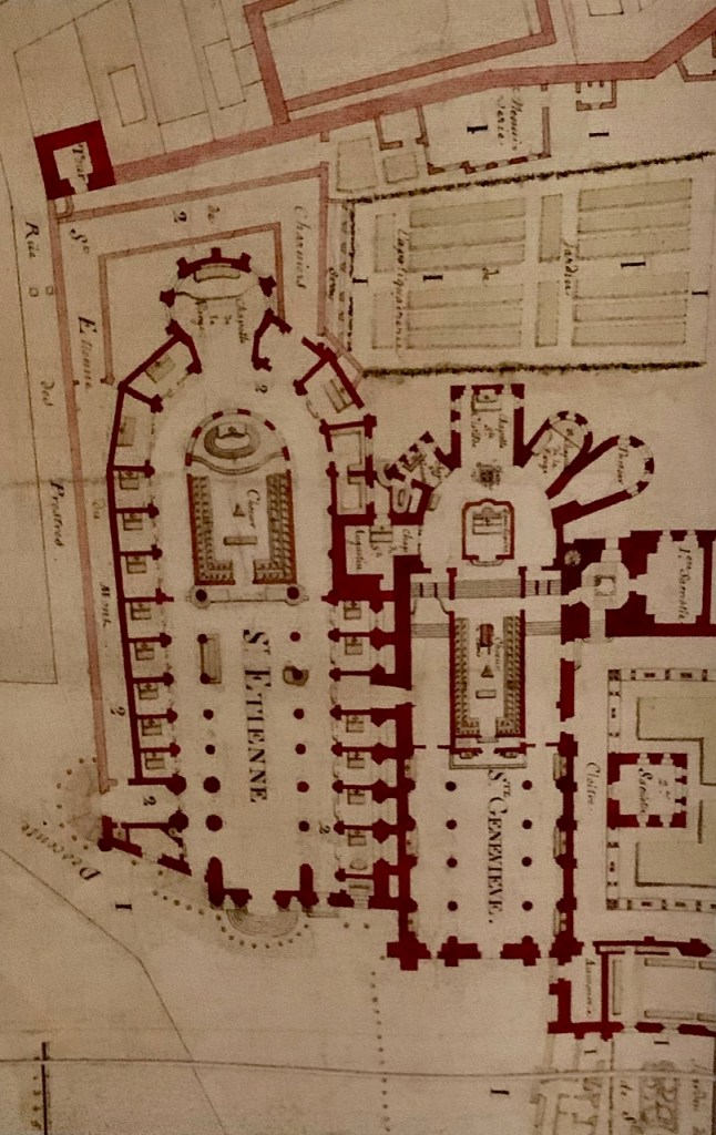 右の部分がSainte Geneviève。今はここに道が通っており、道を隔てて Lycée Henri 4 があって、塔だけが残っている。