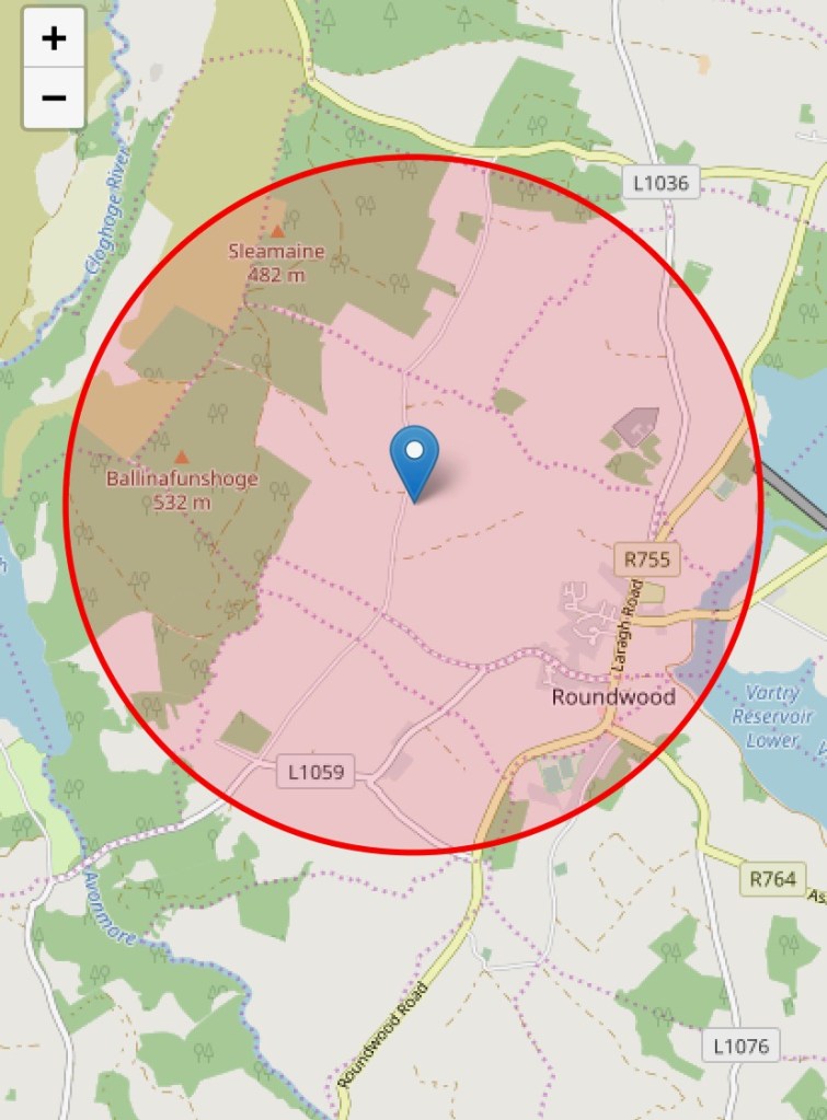 ダブリンへ行くときなど、車で右へ曲がって真っ直ぐ行くと、T字路になるのですが(サリーギャップへの峠道の途中へ出る)そこまで行くと2kmをちょっとだけ(20mとか)オーバーする程度であることがわかった。