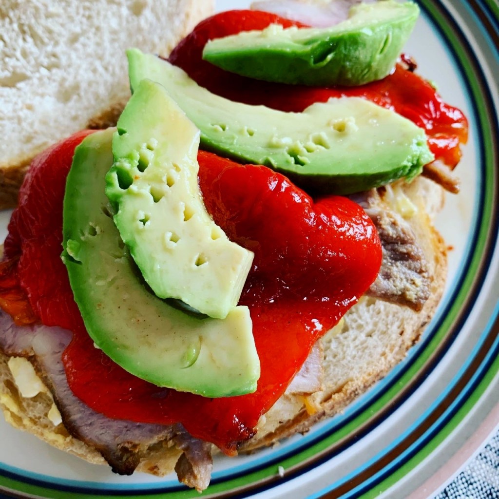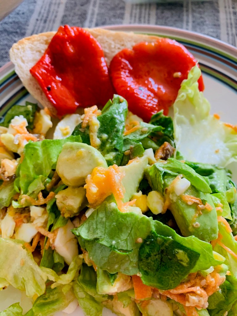 4月30日 残り物のポークチョップと卵マヨ和えとサラダとグリルペパーで サンドイッチのランチ。