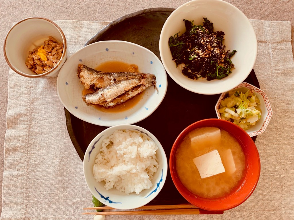 それから納豆と白菜の塩もみ(水気をよく絞ってエゴマ油と酢を少々、塩昆布をぱらぱら、すりゴマもぱらぱらして混ぜた常備菜)、ほうれん草の海苔和え。