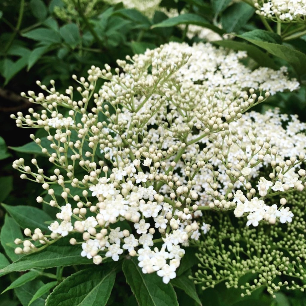 サンザシの花が終わってエルダーフラワーが花盛り、ブラックベリーの花の蕾も。