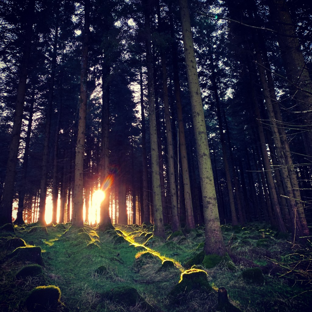 森のなかを歩いていたら沈み始めた太陽の光が苔を照らしていました。