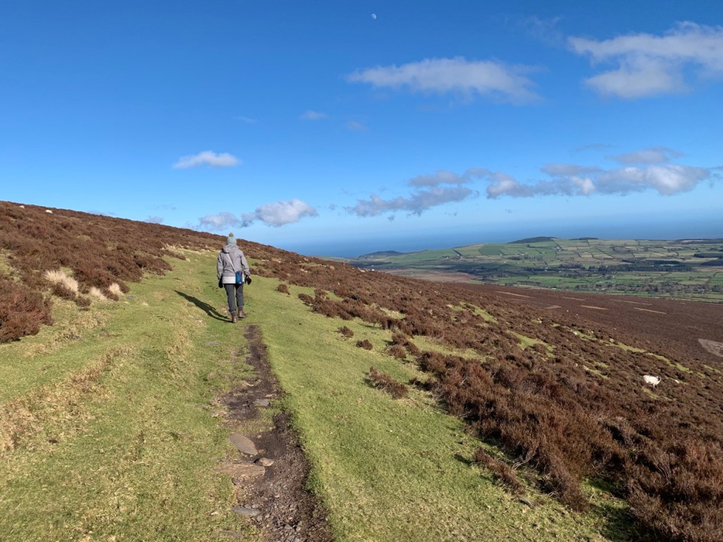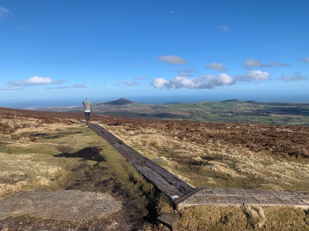 頂上の下を回り込むウイックロウウェイに沿って反対側へ出ると、眼下にクローンウッドから登ったモーリン山と遠くにはダブリン方面の海を見渡す景色。