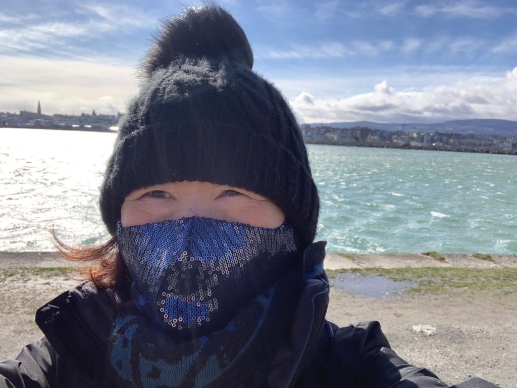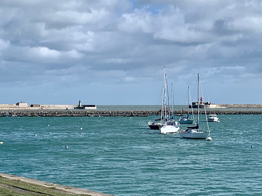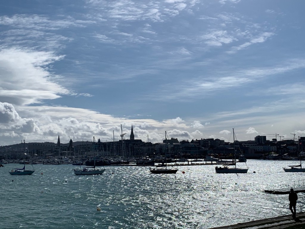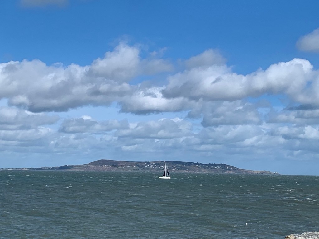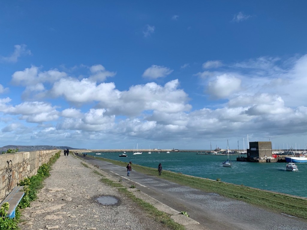 壁の外側を見ると遠くにダブリンの発電所やダブリン空港へ着陸する直前に見えるハウス(Howth)の半島が見えます。ヨットが通って行くのが見えて、とても素敵でした。