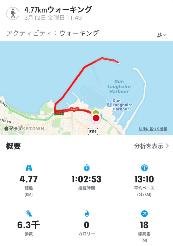 さて 3月12日 バーニーの検診でダンリアリーの病院へ行ったので、sachanは待っているあいだに西の桟橋(West Pier) のほうへ探検に行ってきました。強風だけど快晴、往復4.77 km。