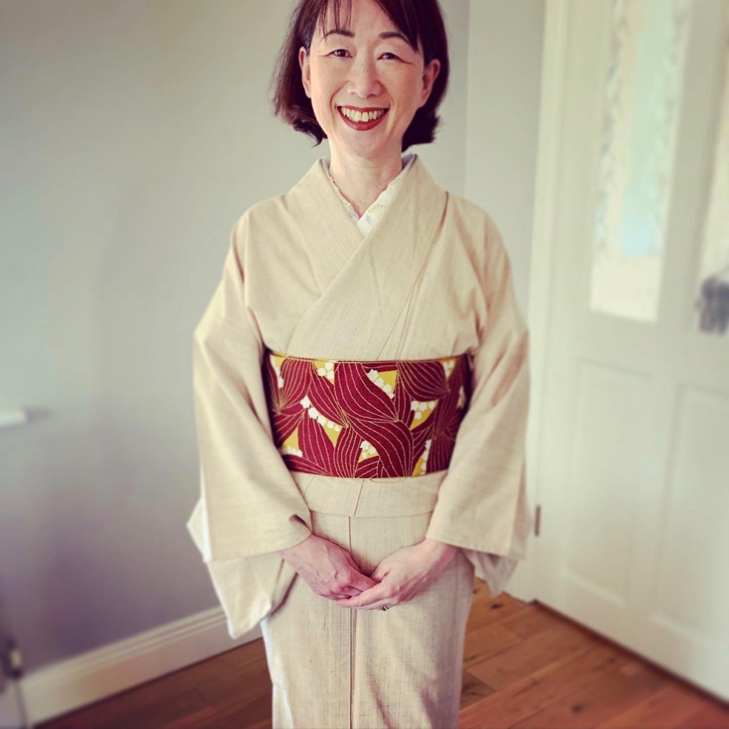 La première fois de mettre cet Obi, je mettais ce kimono en coton souvent pour la fête d’été du village (qui n’a pas eu lieu l’an dernier et probablement pas cet été non plus sniff) et au mois d’août, je ne mettais pas les muguets, mais les lys.