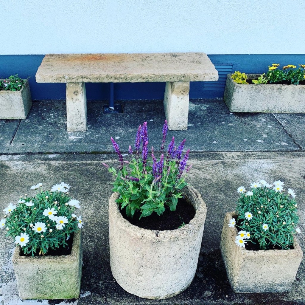 4月29日 友だちのマーガレットさんの指導のもとに ガーデンセンターでいっぱい植物を買ってきて、植木鉢ガーデニングの始まりです。とは言っても、ぜんぶ彼女が植えてくれたんだけど。