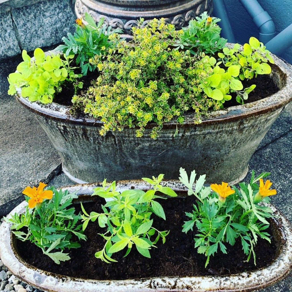 植木鉢のサイズによって、いろんな植物を組み合わせで植えるのだけど(そんなのやったことなかったね?)