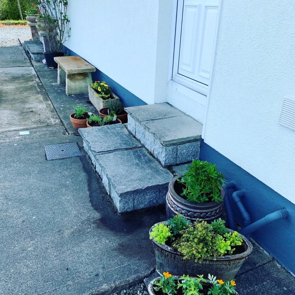 左のほうにあったベンチを移動して、キッチンのドアと居間のドアのあいだに据えて、同じ色の植木鉢を配置して、お庭コーナーになりました。