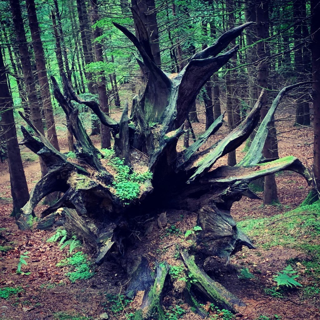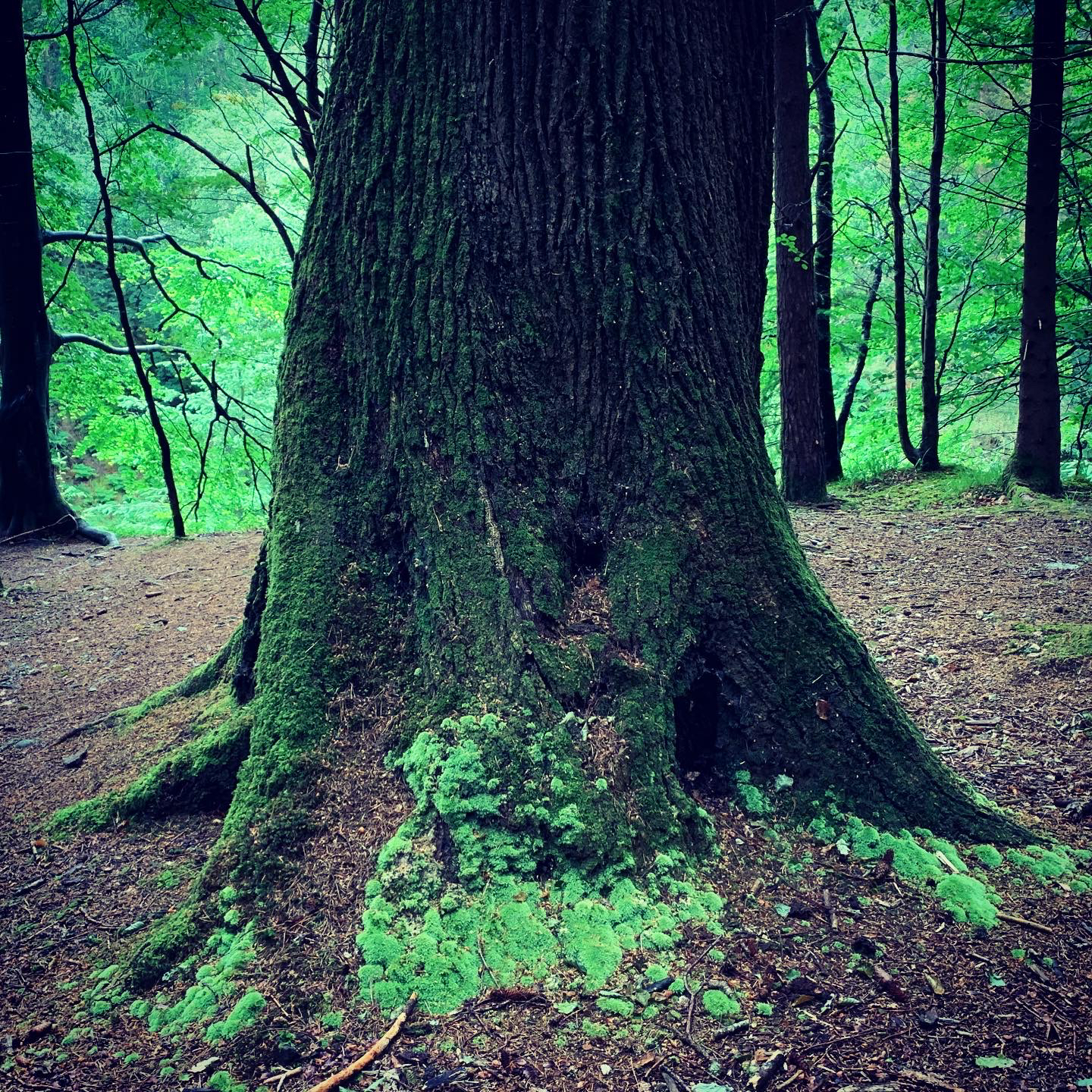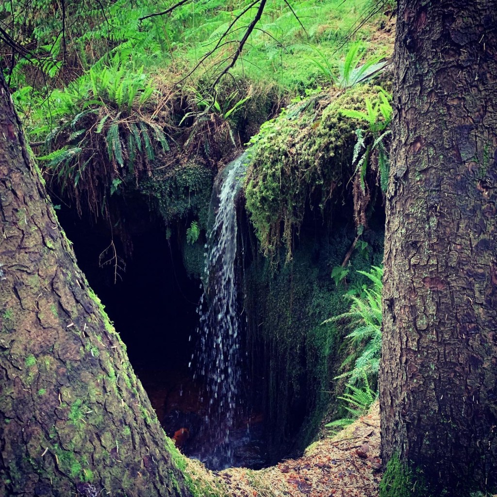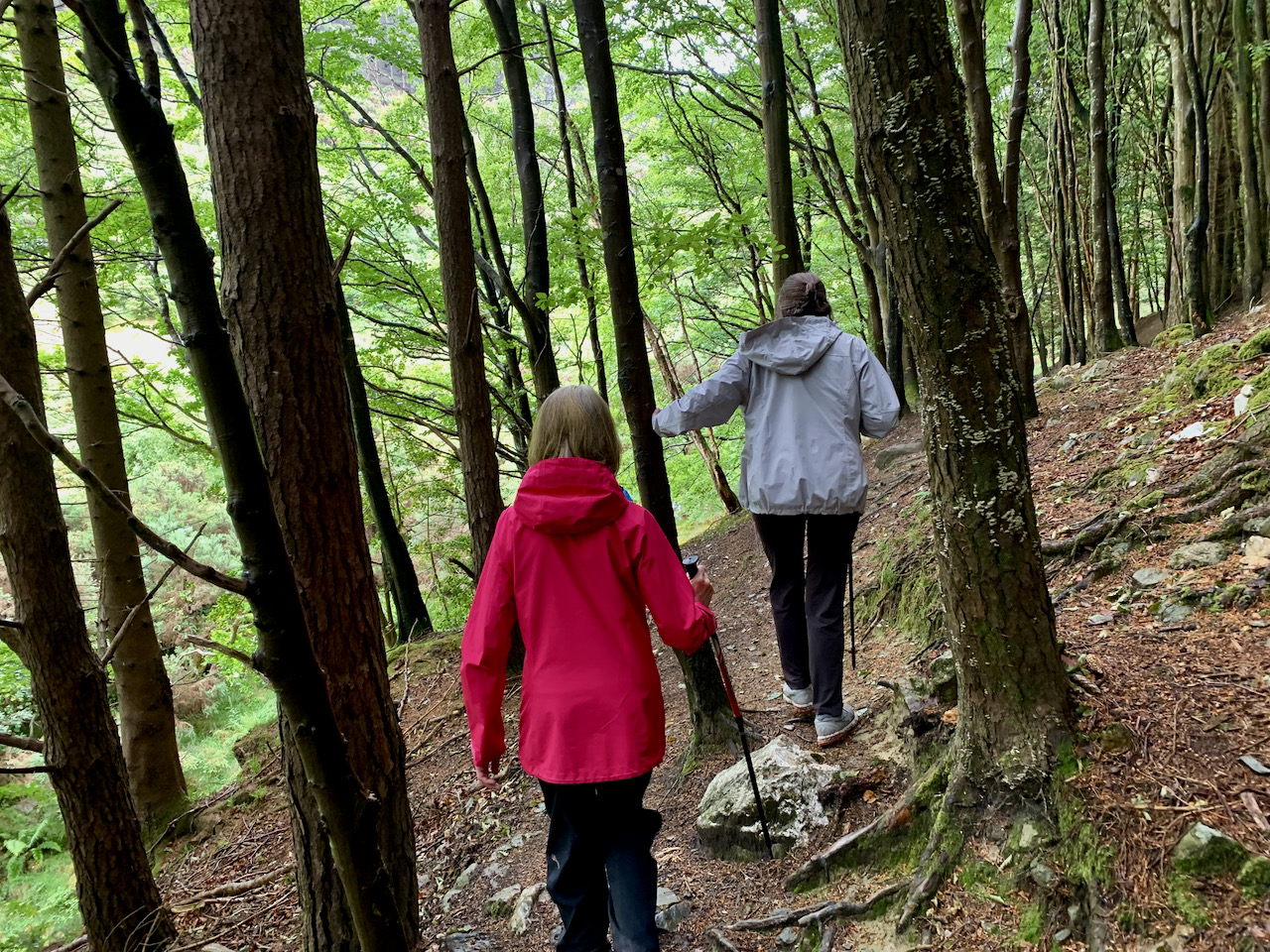 今回は谷川の流れる下のほうへ降りずに、小さな滝のある側から森をつっきるコース。