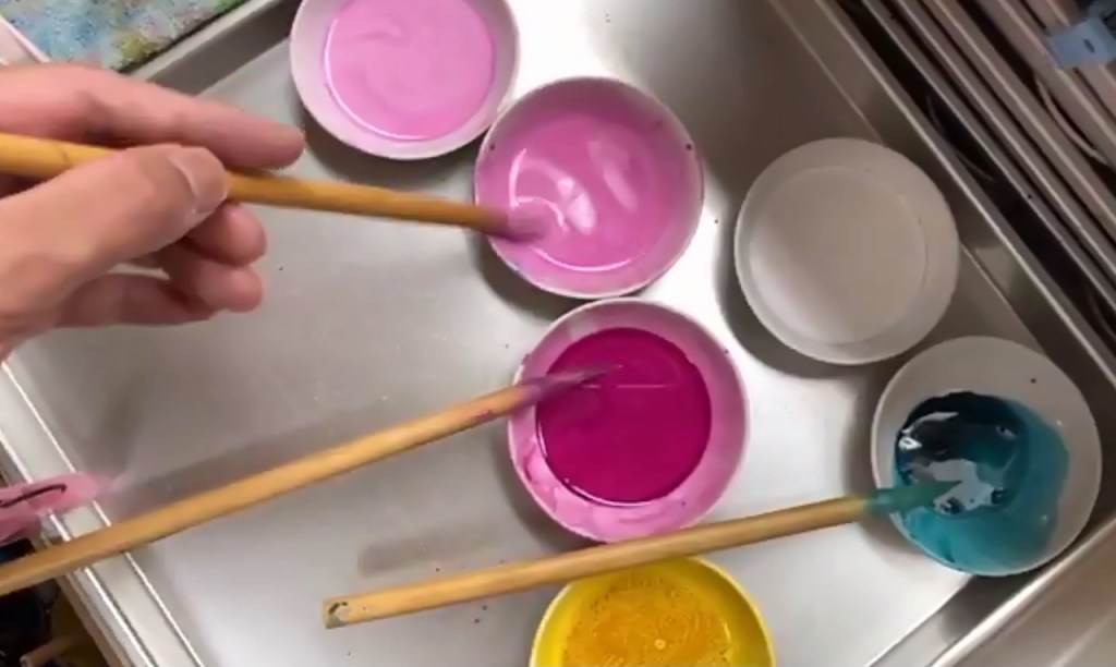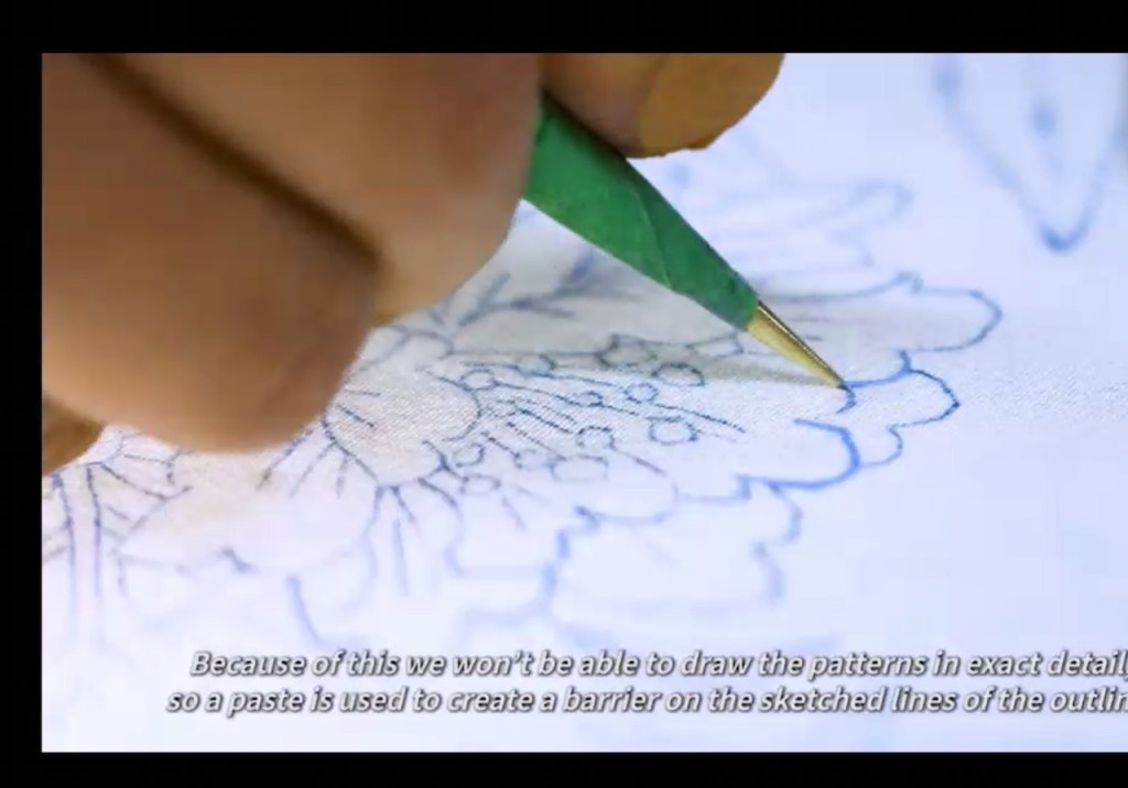 模様を描き終わると、その上をまた糊で覆ったうえで、地色を染める。