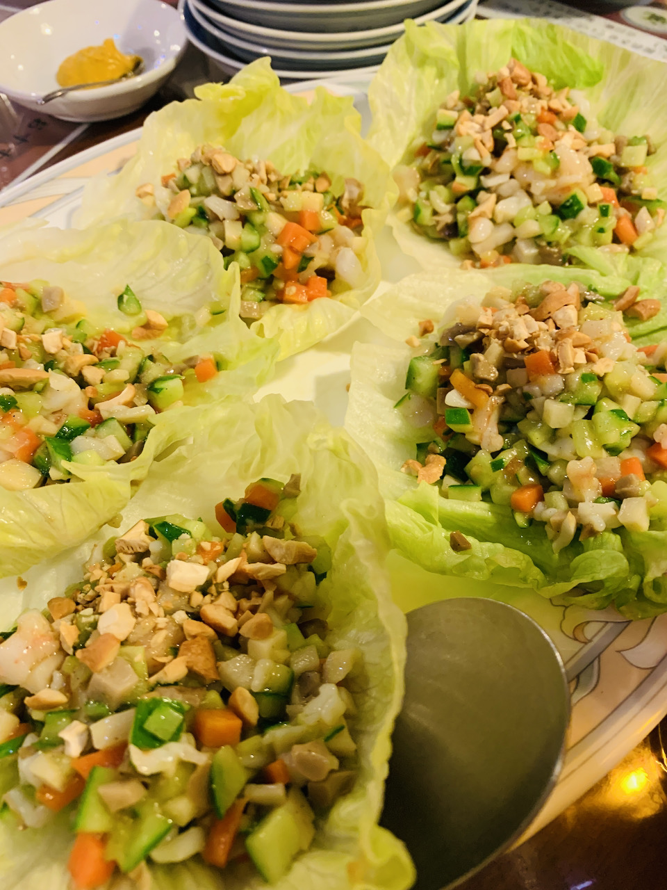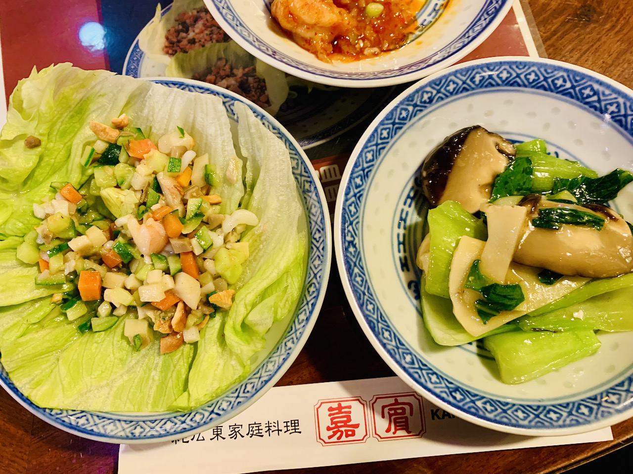 前菜から、エビチリ、蟹玉、レタス包み、椎茸に青梗菜。最後はおこげ料理(おしゃべりに忙しくて写真撮り損ないました)ビールと紹興酒も美味しくて、食べ過ぎ飲み過ぎでした。